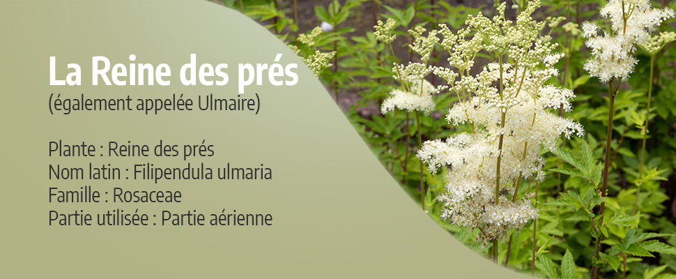 De son nom latin Filipendule ulmaria (L.) Maxim., la Reine-des-prés vient de la famille botanique des Rosaceae. Ses tiges sont rougeâtres et robustes. Elle possède de grandes feuilles d’un vert sombre dessus, et d’un blanc feutré dessous, composées de plusieurs folioles. Les fleurs sont d’un joli blanc crème, elles sont petites et multiples. L’odeur de la Reine des Prés est suave et très prononcée, la saveur est douce et agréable, légèrement amère et herbacée. Ses racines sont munies de fibres non renflées.