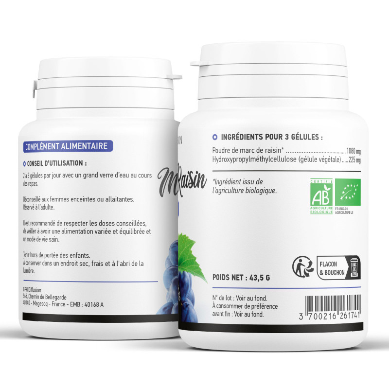Pilulier de gélules végétales de Marc de Raisin Bio dosées à 360 mg.