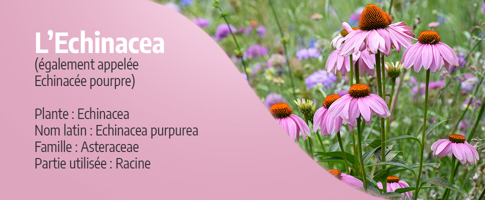 L'échinacée est une plante originaire d'Amérique du Nord. En réalité, il existe plusieurs espèces du genre Echinacea dont trois sont réputées pour leurs effets bénéfiques sur le bien-être. Il s'agit de l'Echinacea angustifolia, l'Echinacea purpurea et l'Echinacea pallida. Toutes proviennent de la famille botanique des Astéracées qui contient principalement des fleurs composées. Celles-ci ont l'apparence d'une fleur simple mais elles sont toutefois « composées » de minuscules fleurs appelées capitules.