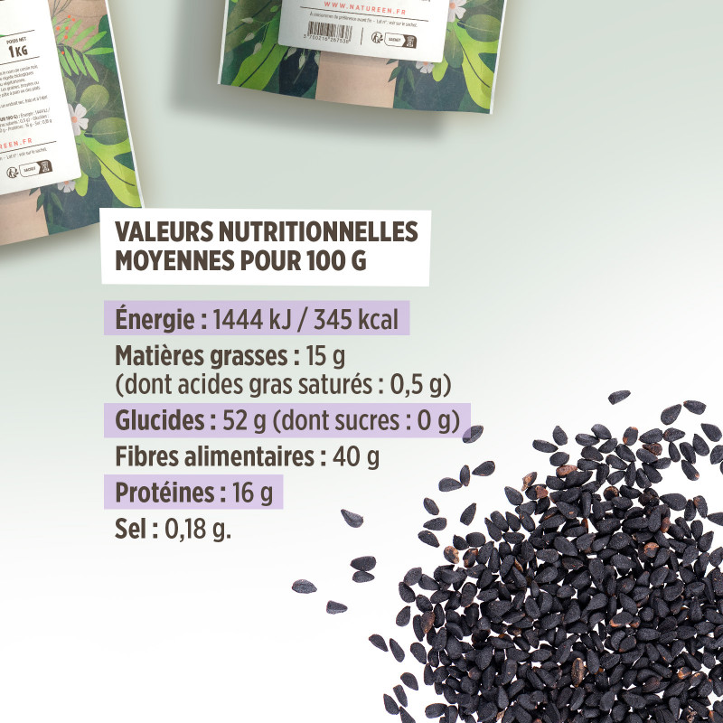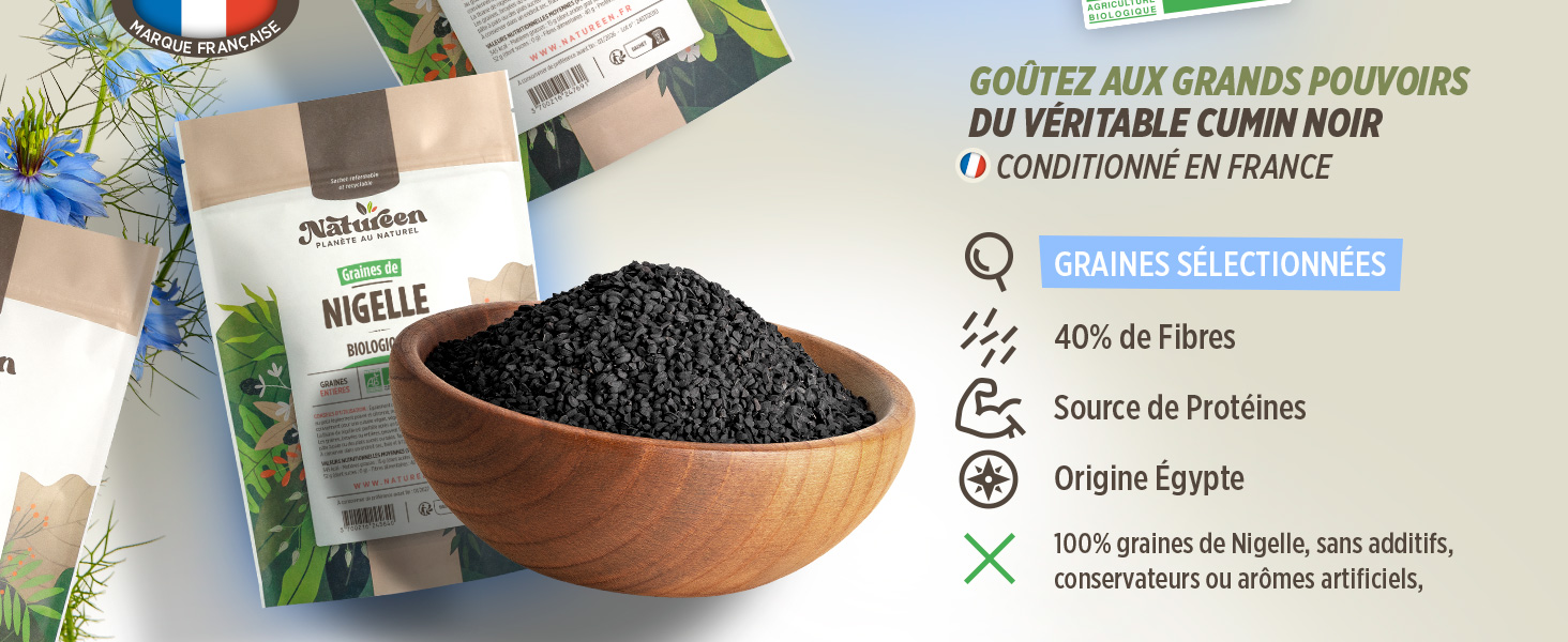 Nos graines de nigelle, certifiées biologiques, sont parfaites pour une cuisine végétalienne, végétarienne ou végan. Riches en protéines végétales et en nutriments essentiels, elles peuvent être utilisées entières ou broyées pour parfumer pains, plats salés, desserts ou mélanges de graines. La tisane de nigelle, quant à elle, est idéale après un repas. Polyvalentes et faciles à intégrer au quotidien, les graines de nigelle apportent saveur, caractère et bienfaits à votre alimentation grâce à ce goût unique de cumin noir.