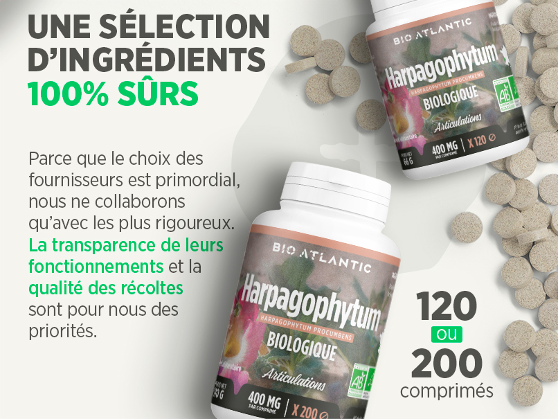 De plus, l'harpagophytum porte différents surnoms qui sont notamment la racine de Windhoek, mais aussi la griffe du diable, une appellation plus commune. Si on lui attribue ce nom, c'est par son apparence caractéristique, ses fruits étant dotés d'un crochet très imposant. Vous pourrez profiter ici d'harpagophytum bio, cultivé dans les règles de l'art, pour un complément alimentaire de très grande qualité, qui vous sera utile jour après jour afin de pouvoir gérer un certain nombre de petits maux articulaires du quotidien.