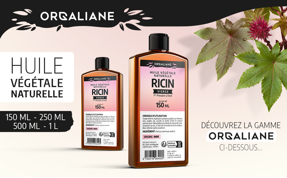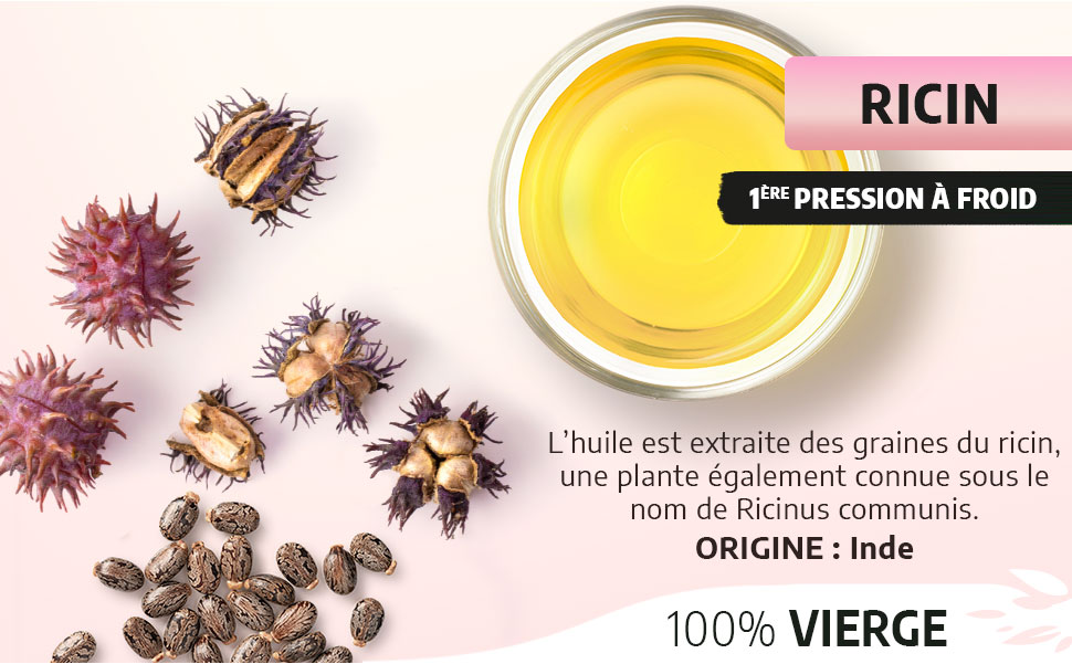 Huile végétale de Ricin vierge Ricinus communis, première pression à froid, origine Inde. Flacons de 150 ml, 250 ml, 500 ml ou 1 litre : choisissez le volume qui convient à vos soins maison.