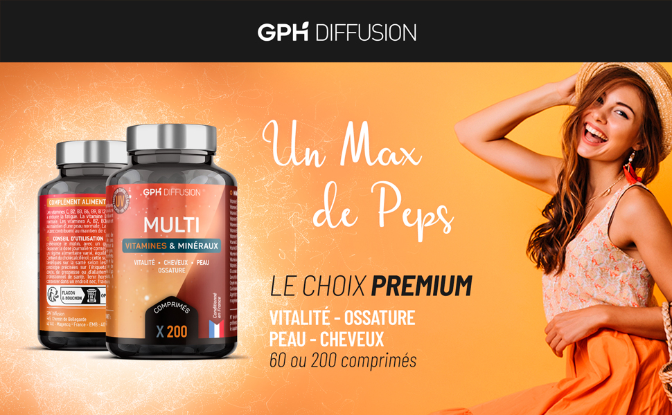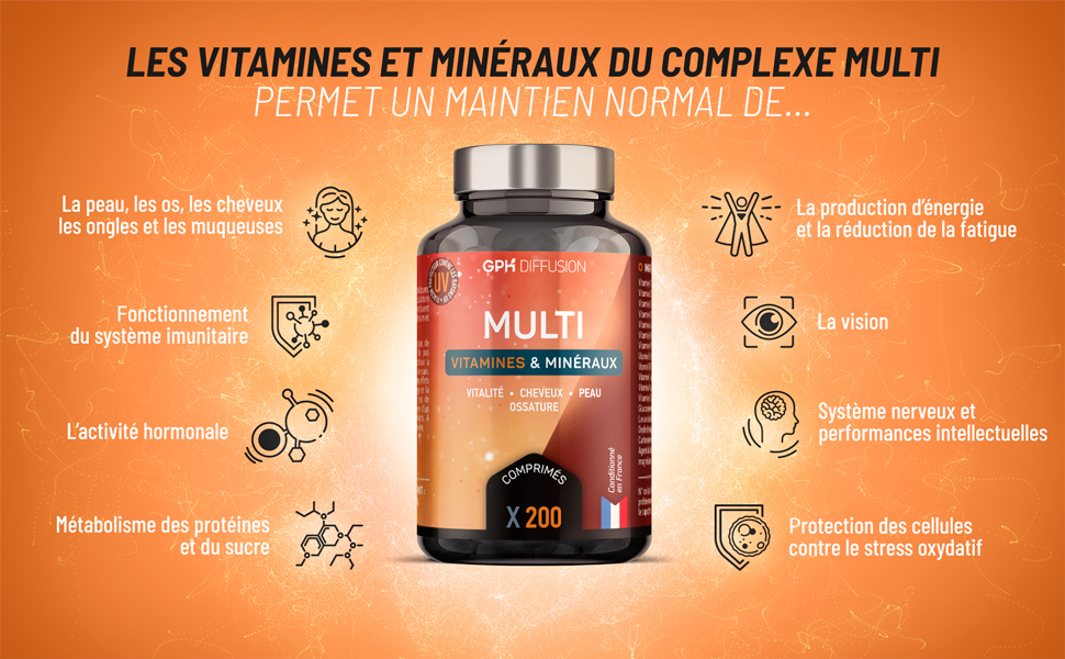 Vous trouverez également dans notre complément alimentaire les vitamine C, vitamine E, vitamine A et vitamine D3. Pour finir, les 4 minéraux essentiels de ce complexe vitaminé sont le zinc, le sélénium, le magnésium et le calcium. En associant notre produit à une alimentation saine et une activité sportive modérée, vous pourrez ainsi faire le plein d'énergie !