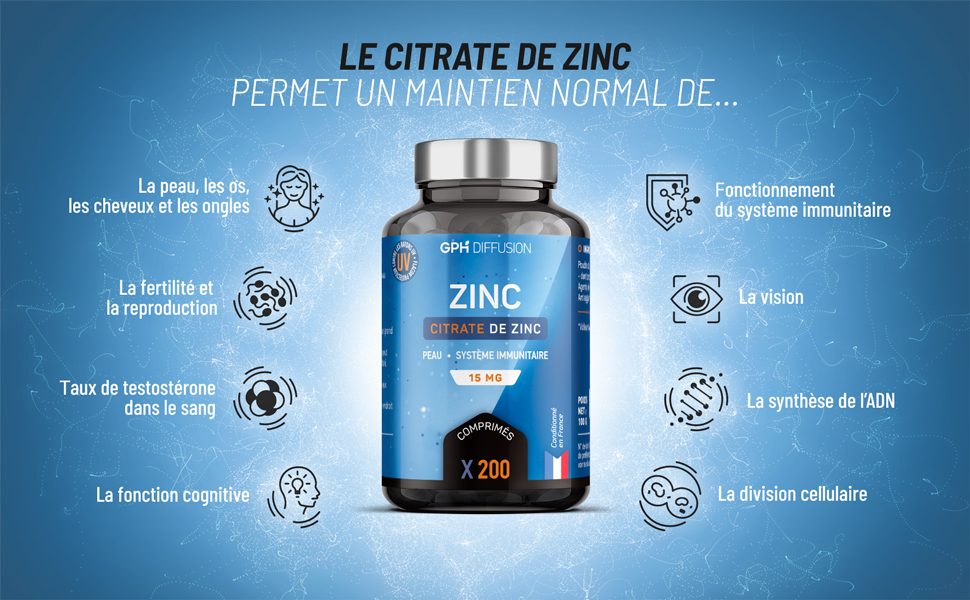 Optez pour une forme hautement assimilable de zinc avec nos comprimés de citrate de zinc 15 mg. Essentiel pour la peau et le bon fonctionnement du système immunitaire, le zinc joue un rôle clé dans de nombreuses fonctions biologiques. Découvrez ici tous les atouts de ce complément alimentaire !