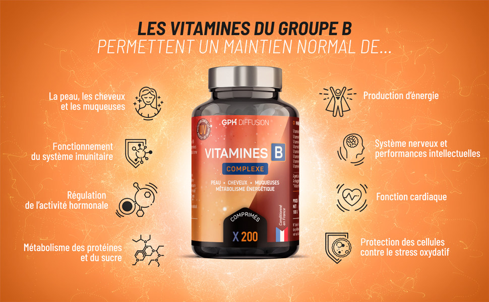 Notre complexe est composé des vitamines du groupe B (vitamines hydrosolubles). En une seule prise, vous atteignez 100 % des valeurs nutritionnelles recommandées pour ces huit vitamines essentielles à l'organisme ! Nos comprimés sont faciles à assimiler, pour un quotidien bien plus serein…