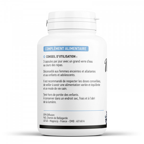 3 capsules par jour avec un grand verre d’eau au cours des repas.