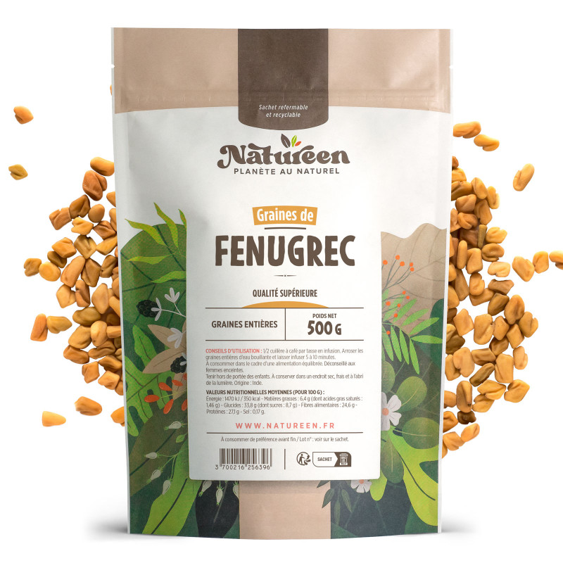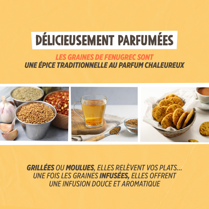 Utilisée comme un aliment dans de nombreuses régions mais aussi comme complément alimentaire, la graine de fenugrec possède une saveur légèrement amère, proche de celle du céleri. On peut la cultiver en région tempérée où elle demande peu d’entretien. Les feuilles des plantes aromatiques sont utilisées pour le fourrage, tandis que les graines sont généralement récoltées pour l’alimentation humaine. Originaire d’Afrique du Nord (Ici, d’Égypte), les graines de Fenugrec proviennent d’une plante herbacée connue sous le nom scientifique de Trigonella foenum-graecum. Alors que Trigonella a pour racine étymologique triangulaire, en référence à la forme des grains, foenum-graecu peut se traduire par Foin grec. La plante annuelle est également surnommée Trigonelle ou Sénégrain.