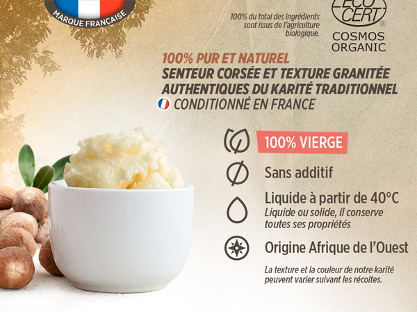 Certains détails pourront vous aider dans le choix de votre beurre de karité. La couleur d'un bon beurre de karité doit être légèrement jaune. Sa texture est solide, légèrement onctueuse. Son odeur est quant à elle caractéristique. Une fois appliqué sur la peau, le beurre de karité perd son parfum au bout de 5 minute environ.