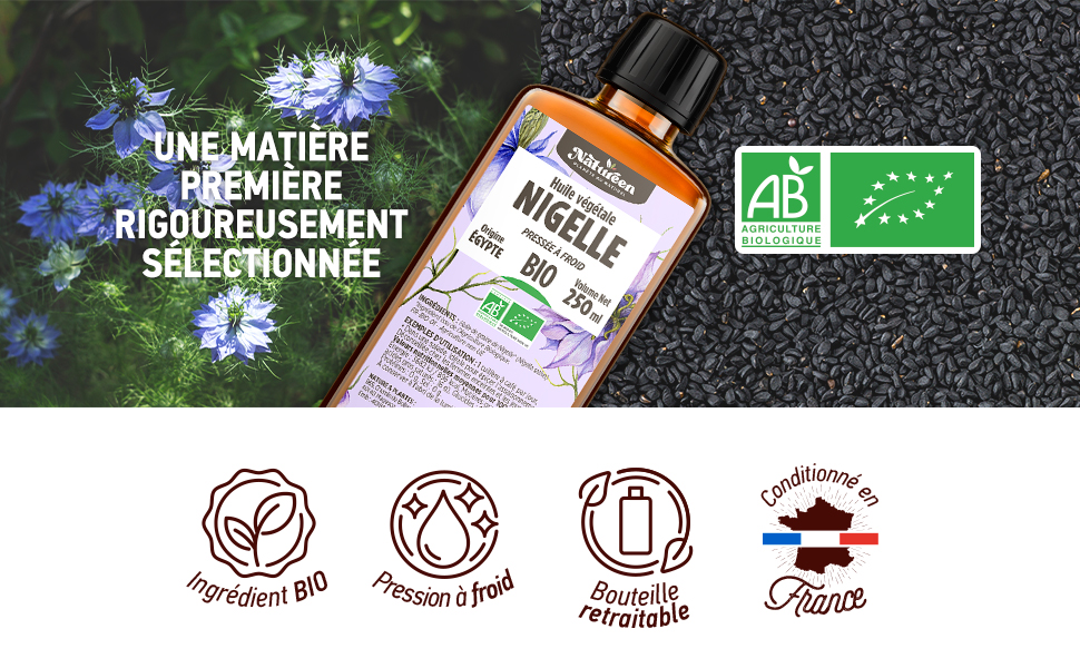 La couleur ambrée de l'huile de nigelle lui vient des petites graines noires qui ont été pressées pour obtenir de l'huile douce et épaisse. Notre huile de nigelle bio est une huile pure et pressée à froid. Une première pression à froid permet à l'huile de garder intacte la plupart de ses atouts nutritionnels. Un point essentiel pour son utilisation en cuisine mais aussi en cosmétique !