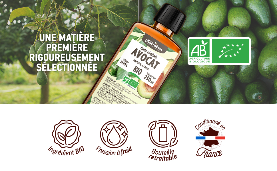Tout comme notre huile de jojoba et notre beurre de karité, l'huile d'avocat que nous vous proposons est une huile végétale bio de haute qualité. Vous profitez ainsi d'une huile vierge issue d'une première pression à froid.