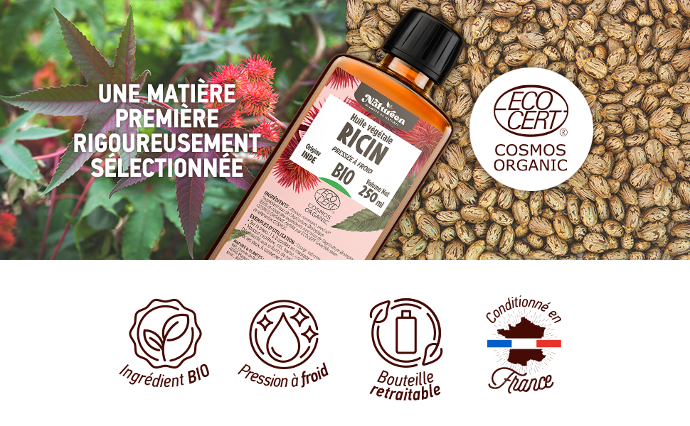 Notre huile de ricin bio est originaire d'Inde. La plante croît ainsi dans un environnement propice, ce qui l'aide à développer ses atouts nutritionnels. Nous vous proposons bien évidemment une huile naturelle qui a été pressée à froid. En effet, une huile de première pression à froid permet d'obtenir une huile vierge de grande qualité.