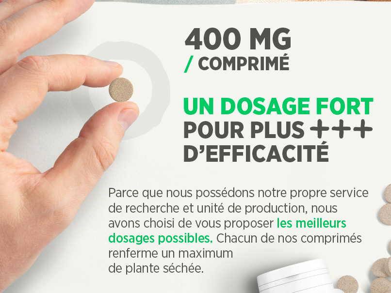 2 à 3 comprimés par jour avec un grand verre d’eau au cours des repas.