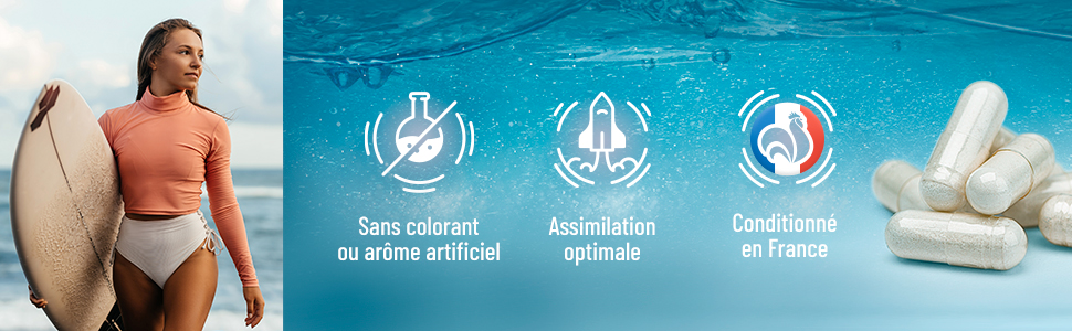 • Poudre d’hydrolysat de collagène marin (poisson): 1360 mg