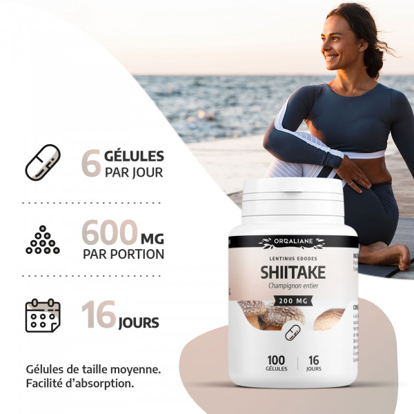 Si vous désirez réellement profiter des propriétés du shiitake, mieux vaut l'utiliser sous la forme d'un complément alimentaire. Ainsi, votre organisme pourra y puiser ce dont il a besoin de manière efficace. Nos gélules de shiitake ont été réalisées avec des morceaux de champignons entiers gorgés de nutriments. Cette supplémentation peut se prendre en synergie avec de l'extrait de pépins de pamplemousse ou du chardon-marie.