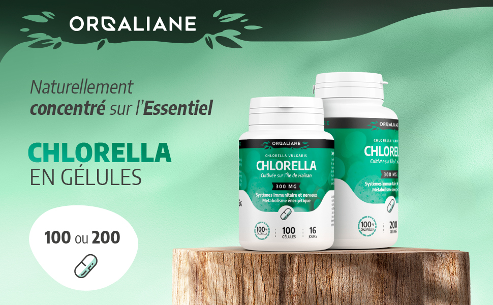Pilulier de 200 gélules de Chlorella dosées à 300 mg .
