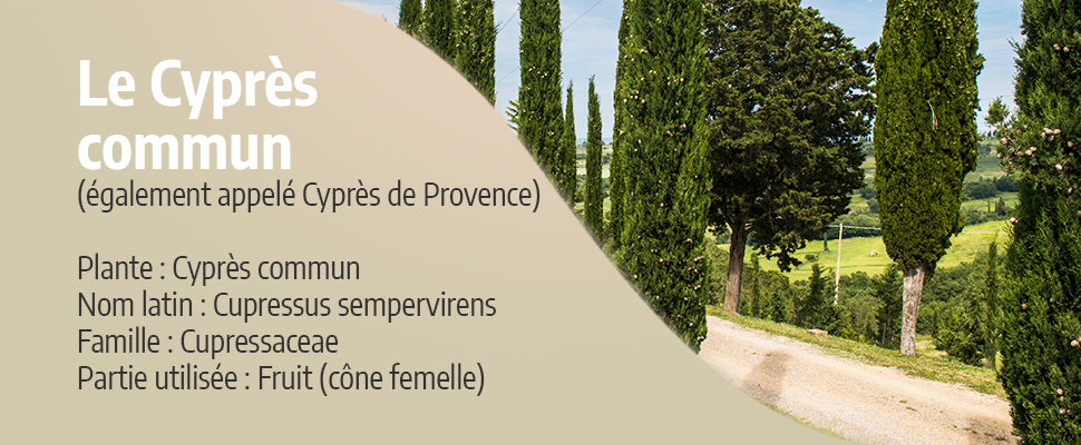 Le cyprès, qui a pour nom latin Cupressus, est un arbre originaire de l'hémisphère nord. Il fait partie de la famille botanique des Cupressacées. C'est un conifère qui possède des feuilles en forme d'écailles triangulaires et de couleur gris-bleuté ainsi que des cônes globuleux mâles ou femelles. En nutraceutique, ce sont les cônes femelles qui sont utilisés pour leurs principes actifs. Ils atteignent leur maturité entre 18 et 24 mois après la pollinisation.
