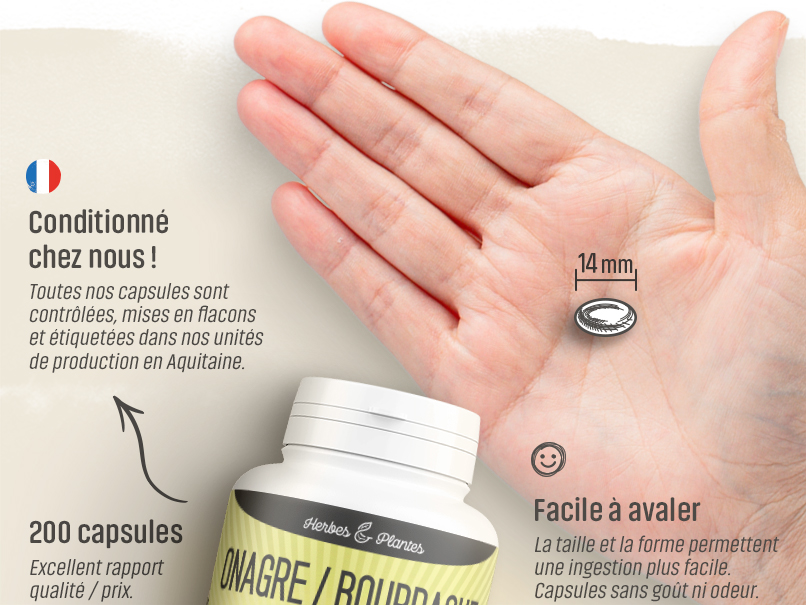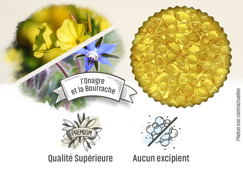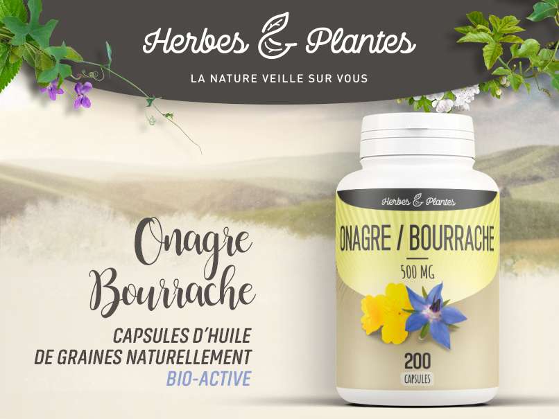 Pour une meilleure absorption des éléments nutritifs, les graines de bourrache et d'onagre ont été transformées en une huile précieuse. Celle-ci a été encapsulée pour permettre une prise rapide et aisée. Les capsules onagre/bourrache de la marque Herbes et Plantes vous sont proposées pour améliorer votre bien-être.