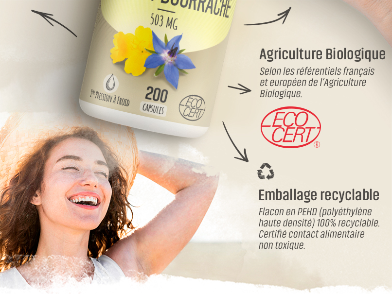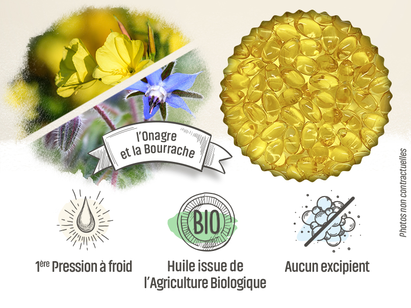 L'huile d'onagre et de bourrache est extraite des graines des deux plantes. Nous les associons dans notre complémentation pour une meilleure synergie. Ce sont des plantes d'origine biologique qui sont ici utilisées, ce qui vous garantit un complément alimentaire de qualité. L'huile de bourrache et l'huile d'onagre sont accompagnées de vitamine E, qui agit sur le bien-être en aidant à combattre le stress oxydatif.
