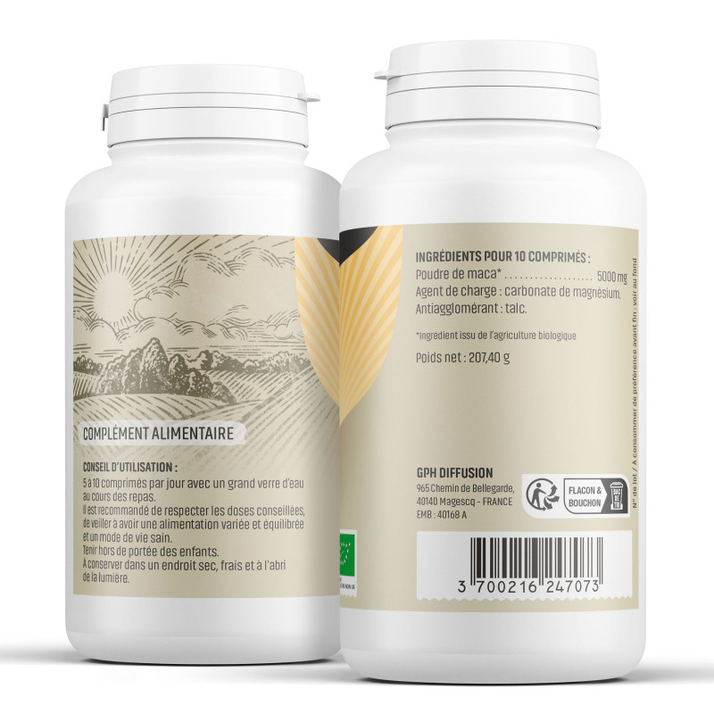 La poudre de maca est transformée dans nos locaux, en France, pour la réalisation de nos différents compléments alimentaires. Nos comprimés sont faits avec de la racine de Lepidium meyenii qui a été sélectionnée pour sa haute teneur en principes actifs. De cette façon, vous profitez d'une complémentation de grande qualité à petit prix.