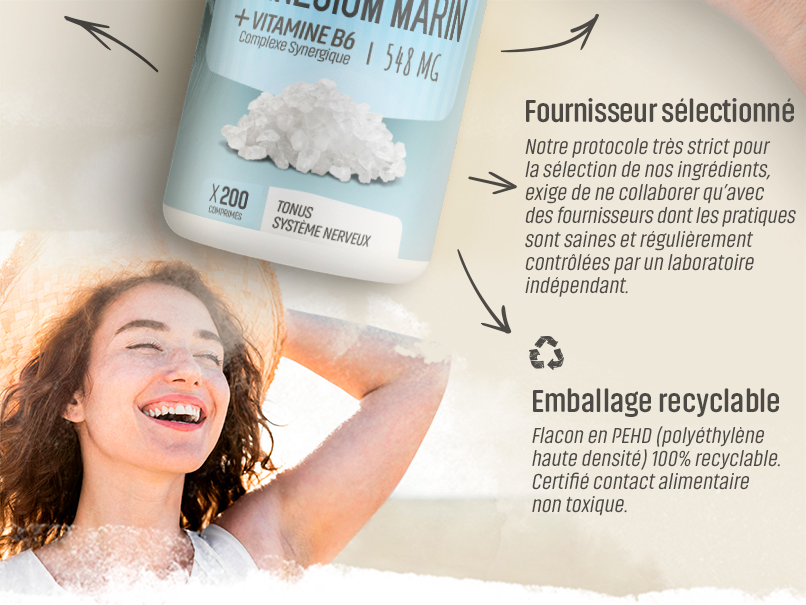 - vous bénéficiez de la synergie entre le magnésium marin et la vitamine B6 pour une meilleure assimilation du produit ;