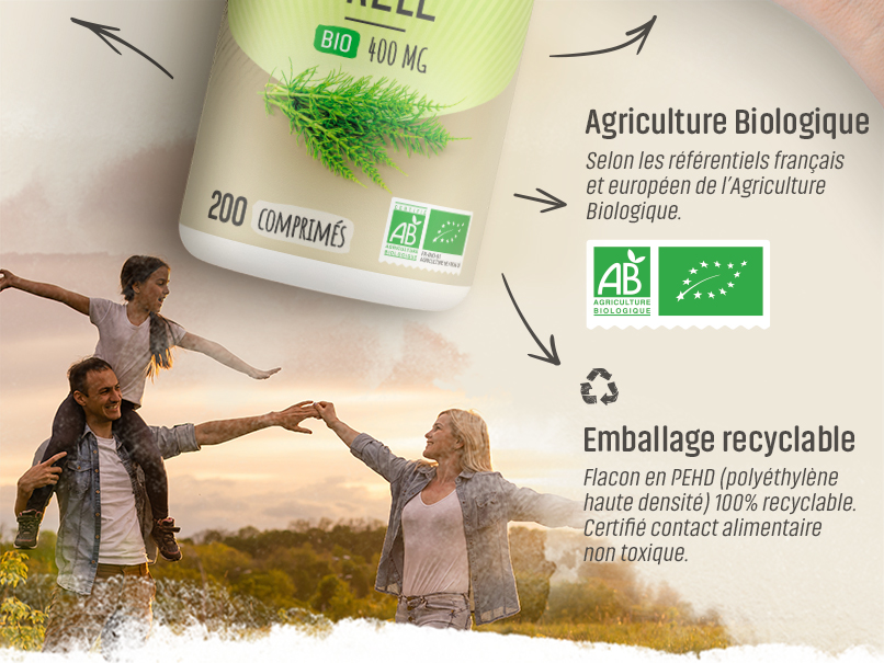 Prenez soin de votre nutrition en combinant nos comprimés de prêle à une alimentation équilibrée et variée. L'Equisetum arvense s'invite dans votre quotidien par le biais d'une complémentation de qualité.