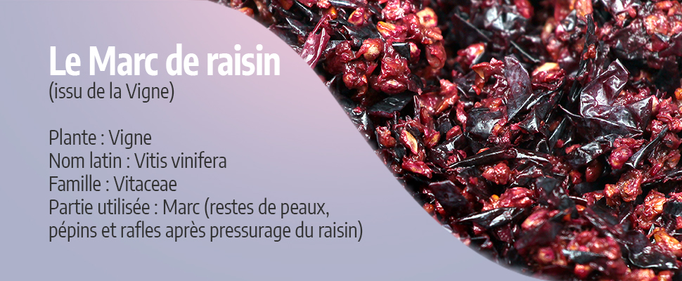 Tout comme les feuilles de vigne rouge, le marc de raisin provient de la vigne cultivée qui a pour nom latin Vitis vinifera. La vigne est une plante originaire des régions tempérée qui est aujourd'hui cultivée dans des nombreuses régions du monde, notamment pour la conception de vin. Les raisins sont récoltés à maturité pour en extraire le jus par pressurage et le marc de raisin est alors mis de côté pour être séché.