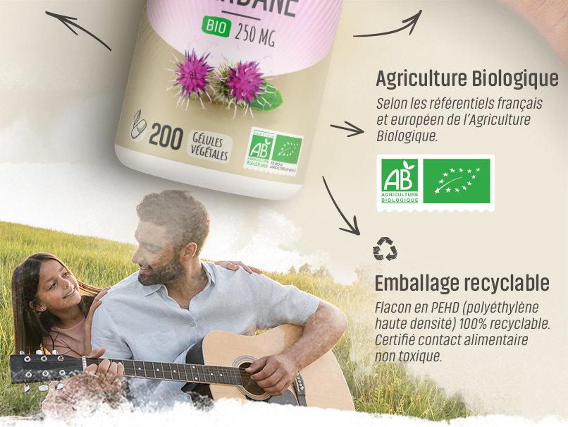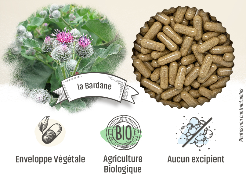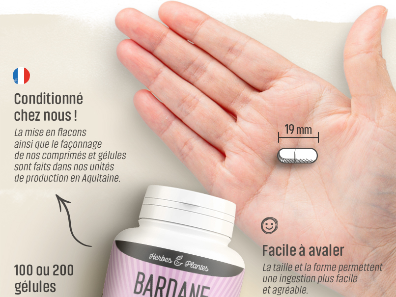 En optant pour ces gélules de bardane bio, vous vous assurez de choisir un complément alimentaire de grande qualité. La bardane que nous utilisons dans notre produit est d'origine biologique. Ce sont les racines de la plante, riches en actifs naturels, qui sont réduites en poudre avant d'être encapsulées. Pour finir, le dosage de nos gélules vous permet une utilisation sécurisée et idéale. Trois comprimés, et le tour est joué !