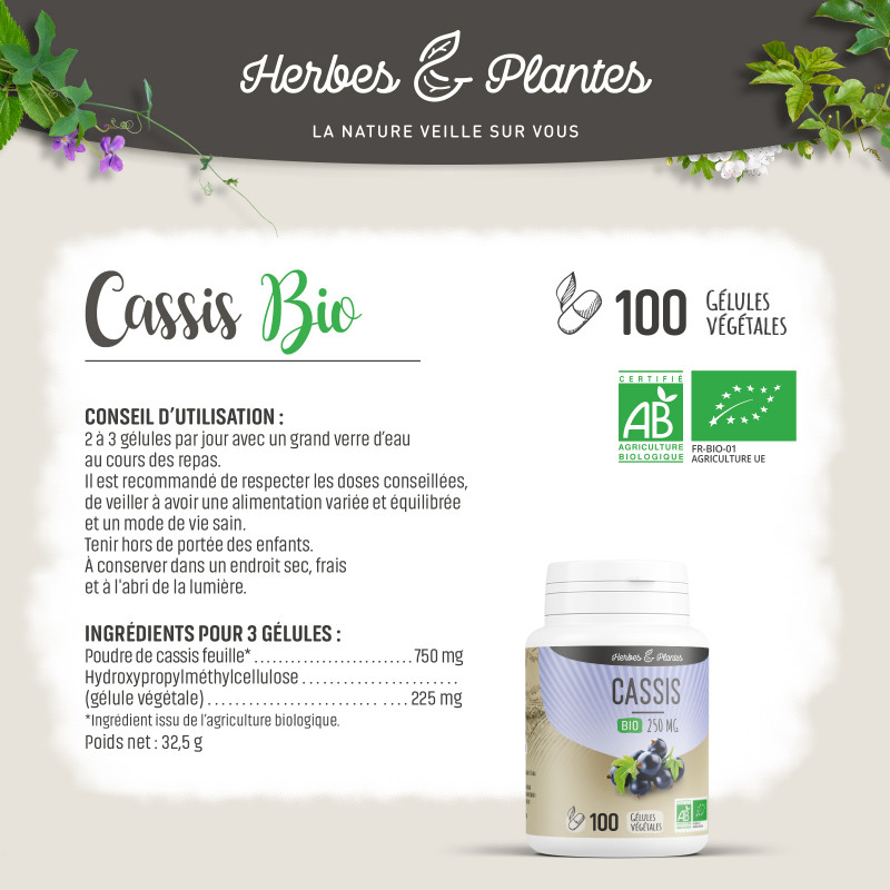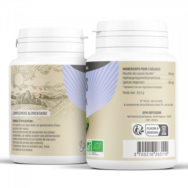 Nos gélules végétales de cassis sont conçues pour s'intégrer facilement dans votre quotidien. Fabriquées à partir de feuilles de cassis biologiques, elles conviennent aux régimes végétariens et végans. En plus d'être faciles à ingérer, ces petites gélules ont une excellente qualité nutritionnelle. En choisissant ce complément alimentaire, vous optez pour une solution naturelle et respectueuse de votre mode de vie, favorisant ainsi votre bien-être au quotidien.
