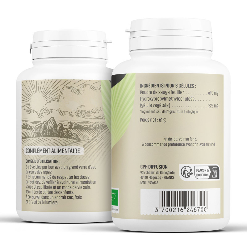 Nous vous proposons dans notre herboristerie en ligne des gélules de sauge faites à partir de plantes biologiques. Nos gélules sont végétales et peuvent donc être prises par les végétariens et les végans. Les petites feuilles sèches ont été réduites en poudre avant d'être encapsulées dans notre complémentation afin de rendre la prise plus aisée.