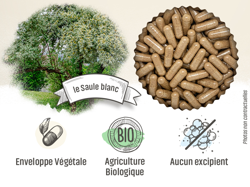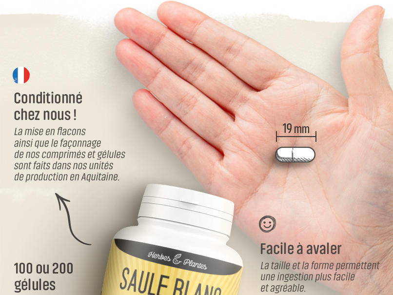 Bien que les écorces soient encore aujourd'hui chauffées dans l'eau bouillante pour en faire des décoctions, les tisanes de saule blanc sont remplacées par des compléments alimentaires plus modernes. Nos gélules de saule blanc sont fabriquées à partir de plantes séchées biologiques tandis que les capsules en elles-mêmes sont végétales. Vous pourrez ainsi faire votre complémentation quotidienne en toute tranquillité.
