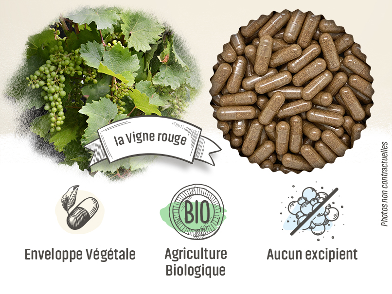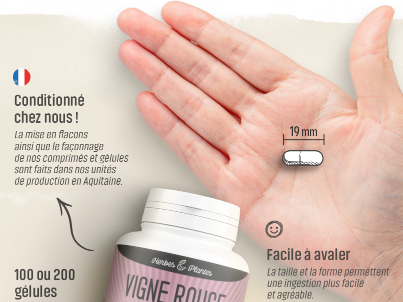 Pour profiter des effets bénéfiques de la vigne rouge, il est préférable de prendre la plante pendant une trentaine de jours, sous la forme d'un complément alimentaire. Bien qu'il soit possible de choisir des tisanes légères au goût âpre, les gélules de vigne rouge vous aideront à prendre le bon dosage au quotidien. Vous pouvez réaliser deux complémentations sur l'année lorsque vous en ressentez le besoin.