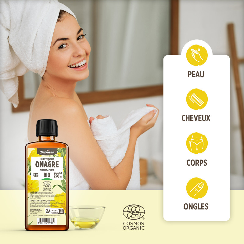 Notre huile d’onagre est vierge, 100 % pure et certifiée biologique, extraite par première pression à froid pour préserver toutes ses propriétés naturelles.