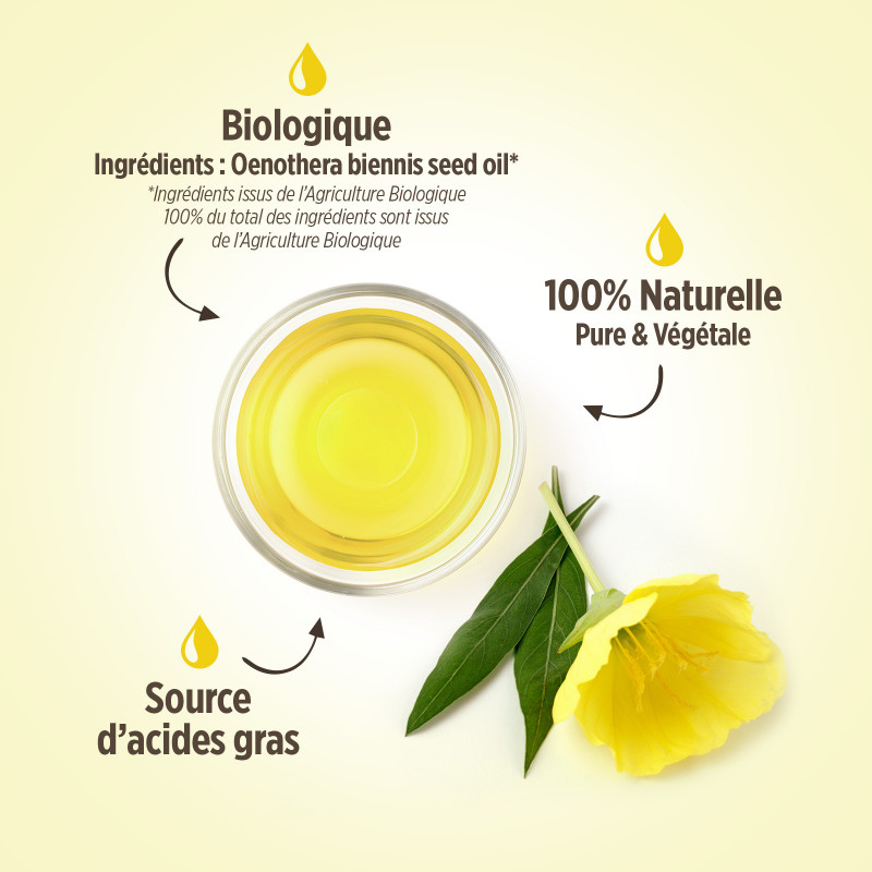 L’huile d’onagre est obtenue à partir des graines de la plante Oenothera biennis. Elle est naturellement riche en acides gras polyinsaturés, notamment en acide gamma-linolénique (GLA), un oméga-6 présent dans les huiles végétales de qualité.