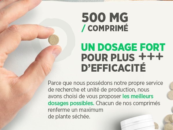 10 comprimés par jour avec un grand verre d’eau au cours des repas.