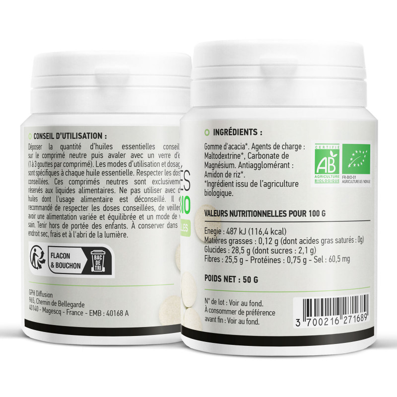 Découvrez les Comprimés Neutres Bio 123gelules, le support indispensable pour vos huiles essentielles à usage alimentaire. Fabriqués en France et certifiés agriculture biologique (FR-BIO-01), ces comprimés sont conçus pour accueillir vos mélanges en toute simplicité, dans le respect d’un mode de vie sain et éco-responsable.