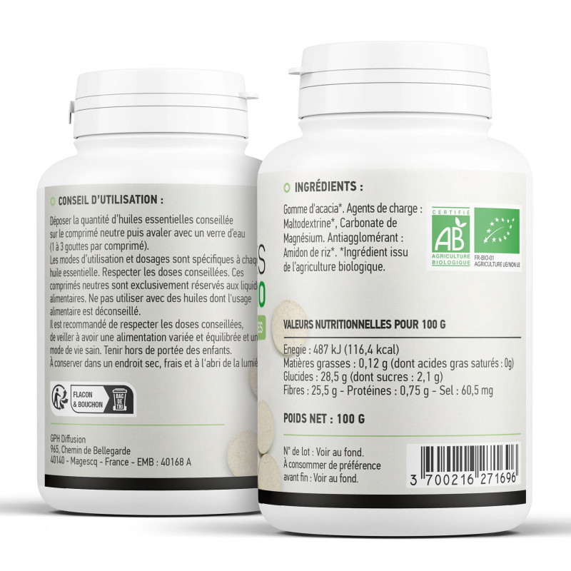 Les modes d’utilisation et dosages sont spécifiques à chaque huile essentielle. Respecter les doses conseillées. Ces comprimés neutres sont exclusivement réservés aux liquides alimentaires. Ne pas utiliser avec des huiles dont l'usage alimentaire est déconseillé. Il est recommandé de respecter les doses conseillées, de veiller à avoir une alimentation variée et équilibrée et un mode de vie sain. Tenir hors de portée des enfants. À conserver dans un endroit sec, frais et à l'abri de la lumière.