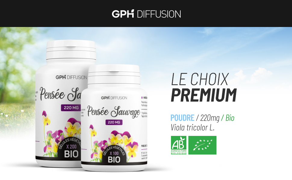 On croise la pensée sauvage dans nombreux jardins où elle y est cultivée pour son côté ornemental, mais on peut également la trouver dans son milieu naturel, en montagne, sur les berges d’une rivière ou dans un terrain en friche. Cette fleur tricolore, connue sous le nom scientifique de Viola tricolor, appartient à la famille des Violacées. Bien sûr, il existe plusieurs espèces décoratives différentes, mais c’est celle-ci qui est essentiellement utilisée dans les compléments alimentaires pour ses nombreux bienfaits. On la reconnait par ses feuilles lancéolées, cordiformes et dentées, ses jolies fleurs solitaires aux pétales irréguliers (tout comme la violette classique), de couleur blanche, jaune, bleue ou pourpre. Bien que surnommée Herbe de la trinité, elle peut être de 2 ou 3 couleurs, mais ce sont ces dernières qui sont bien sûr les plus recherchées pour leur aspect décoratif si particulier.