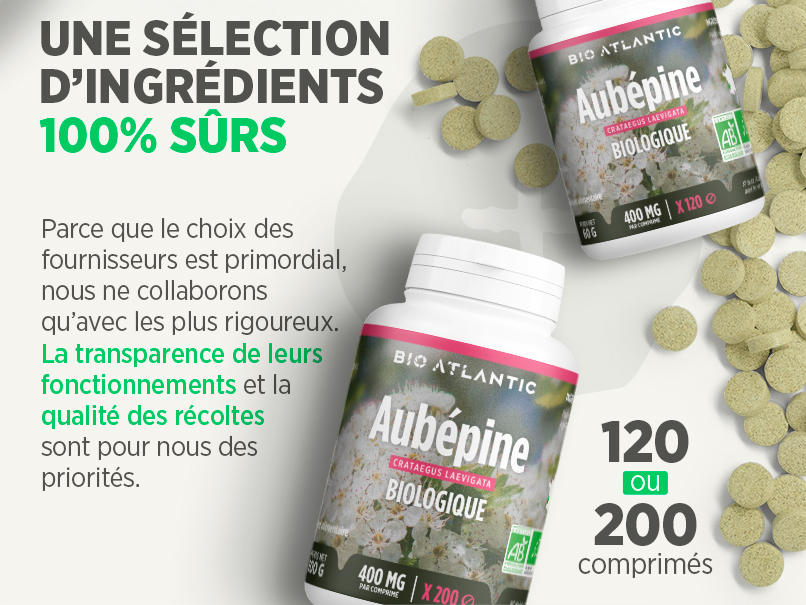 Tout comme dans une bonne herboristerie ou dans un magasin bio de choix, nous vous proposons un produit de qualité mais à un prix tout doux. Notre pilulier d’aubépine BIO est composé de 200 comprimés dosés à 400 mg, il est idéal lors de complémentations ou pour une utilisation exceptionnelle. Sous cette forme, les principes actifs de l’aubépine se prennent de façon quotidienne, très facilement et assez rapidement. Retrouvez également tous les effets de l’aubépine dans notre complexe Sommeil BIO, associés aux propriétés de la passiflore et de l’escholtzia. Pour une utilisation particulière, les effets positifs de l’aubépine peuvent aussi s’unir aux actifs naturels du tilleul, de la valériane, de la camomille ou de la myrtille.