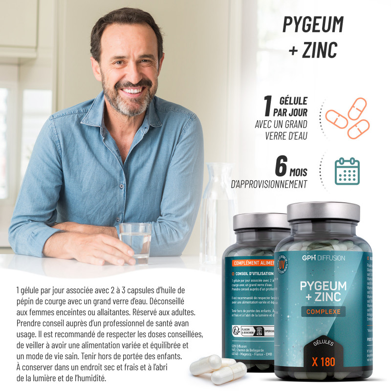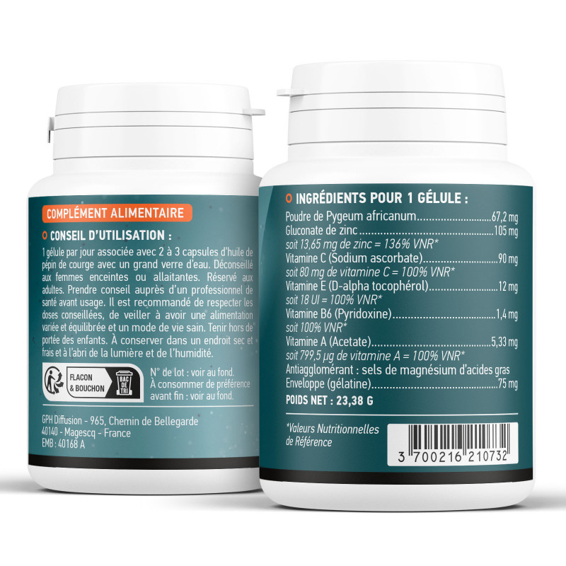 Notre complément alimentaire contient du pygeum africanum associé au zinc pour une efficacité redoublée. Vous trouverez également dans ce complexe plusieurs vitamines (vitamines C, E, B6 et A) qui agissent en synergie sur votre bien-être. Vous pourriez également être intéressé par nos capsules à base d'huile de pépins de courge, une complémentation qui peut s'associer aux gélules de pygeum mais aussi aux gélules de racines d'ortie piquante.