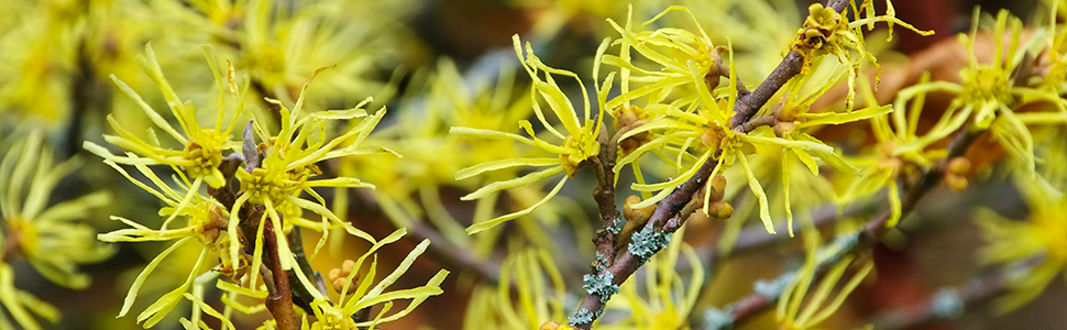 Il existe plusieurs espèces d’hamamélis. L’Hamamelis japonica, comme son nom l’indique, est originaire du Japon, l’H. mollis vient de Chine, l’H. ovalis et l’H. vernalis proviennent tous deux d’Amérique du Nord, quant à l’H. virginiana, il nous arrive tout droit de Virginie. Bien que l’hamamélis de Chine, avec ses superbes fleurs jaunes et l’hamamélis vernalis, connu sous le nom de Noisetier de sorcière, soient appréciés pour leur floraison hivernale exceptionnelle, c’est l’hamamélis de Virginie qui est employé dans les compléments alimentaires pour ses principes actifs contenus dans ses feuilles. De plus, si ses congénères offrent un spectacle fabuleux lorsque leurs fleurs s’ouvrent sur des branches totalement nues, l’Hamamelis virginiana se pare de magnifiques feuilles jaunes en Automne, ce qui le rend également très décoratif dans un jardin ou le long d’une route.