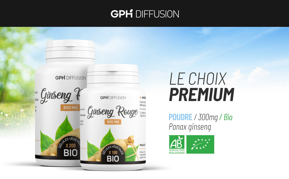 Pilulier de gélules végétales de ginseng rouge bio à 300 mg.