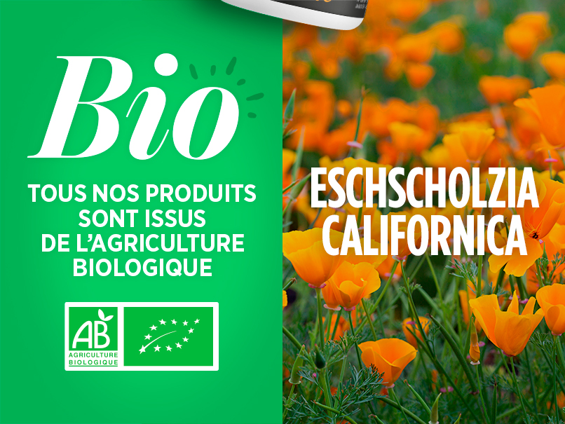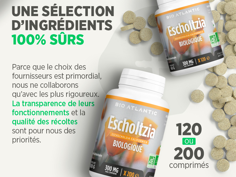 C'est donc la partie aérienne de la plante qui est utilisée pour la réalisation de notre complément alimentaire bio. Fleurs et feuilles ont été récoltées pendant la floraison. Pour une complémentation en escholtzia, il est préférable de prendre les comprimés au soir, dans un dosage entre 800 et 1200 mg. Cette complémentation peut se prendre de façon plutôt occasionnelle, ou lors d'une supplémentation jusqu'à 3 semaines, selon les besoins.