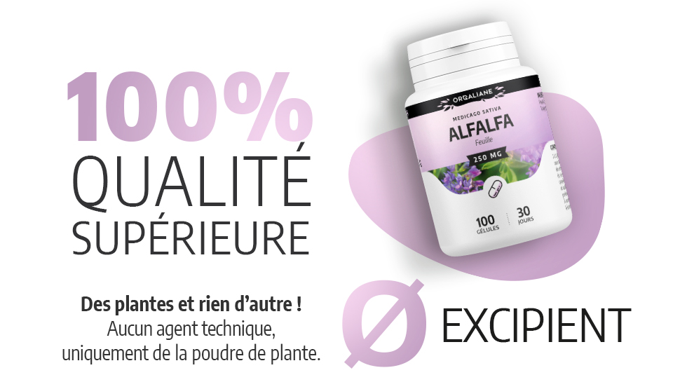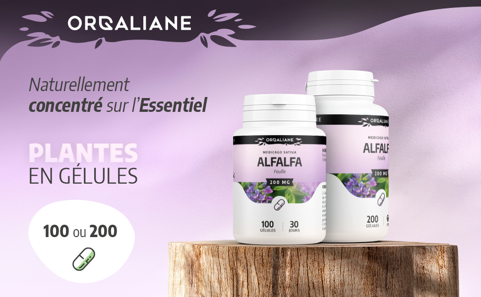 Nos gélules sont quant à elles fabriquées à partir de feuilles séchées réduites en poudre. Les feuilles d'alfalfa contiennent en effet une grande quantité de nutriments, vitamines et minéraux. C'est pour cela que nous avons choisi cette partie de la plante pour la conception de notre supplémentation. Vous profitez ainsi des bienfaits de l'alfalfa de la meilleure des façons ! Notons que la durée d'une complémentation en alfalfa est de 3 semaines à 30 jours environ.