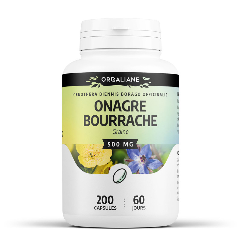 Le bourrache-onagre est une composition d'huile de bourrache et d'huile d'onagre. Nos huiles de bourrache et d'onagre sont obtenues par pression à froid.